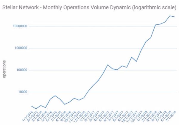 “Stellar Network处理的总的操作的次数呈现稳定的指数50倍的年增长率。2016年有45,729次操作,2017年达到2,234,195次操作,而2018年仅前7个月就已经累积了105,777,179次操作。”