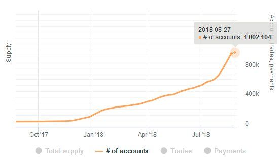 据stellar.expert,8月27号图表数据的显示。Stellar Lumens钱包账户地址在8月27号这一天成功突破了100万大关!上个月7月份Stellar钱包账户地址还仅为65万,短短一个月时间钱包账户地址放量增长了35万。